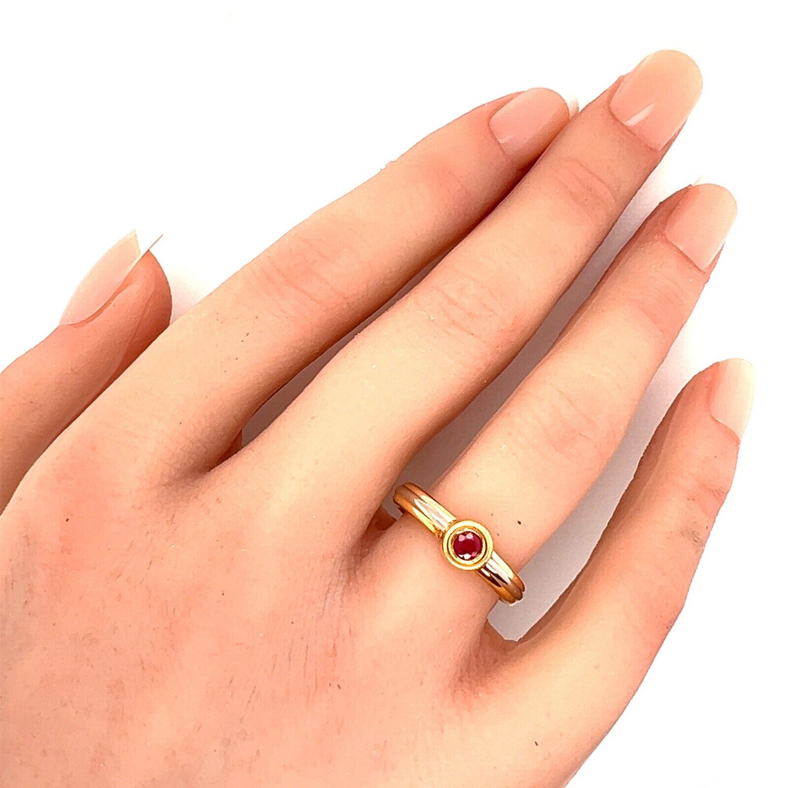 This authentic ring is by Cartier from the Trinity Collection. It is crafted from 18k yellow, rose and white gold with a high polished finish featuring 3 fine wire stacked ring joined together on a 3.5mm wide band and a round cut bezel set ruby gemstone on the front of the ring. It is simple and elegant and has the designer hallmark, serial number, ring size and gold content.