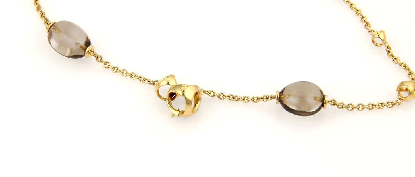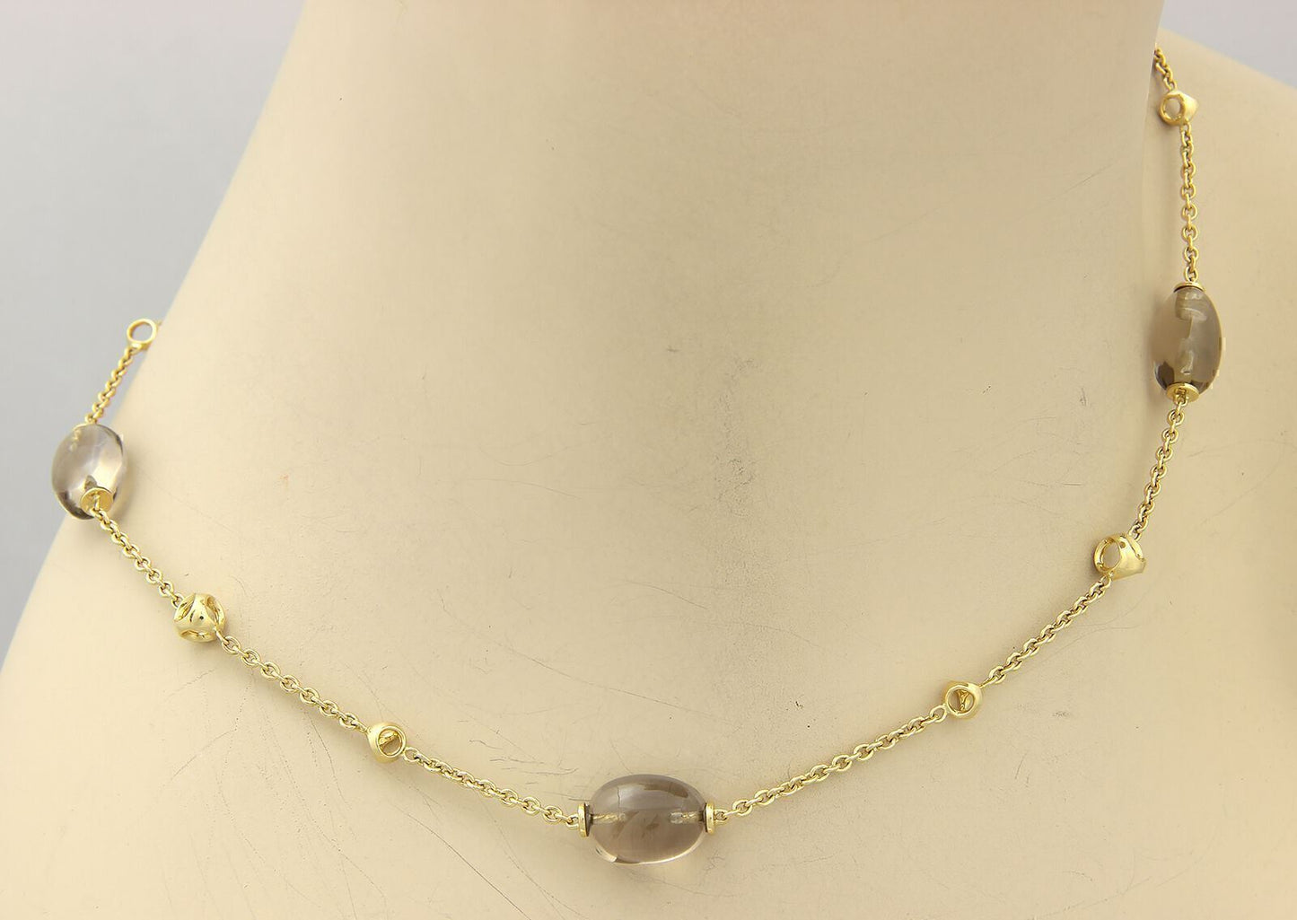 This is a lovely and elegant necklace by designer Di Modolo. It is crafted in solid 18k yellow gold with a fine polished finish. The piece has five lovely transparent smoky quartz oval shape beads attached to the chain accented with Di Modolo's popular open fancy gold work. Fastens with a large open ring clasp. Signed by the designer with the metal content.