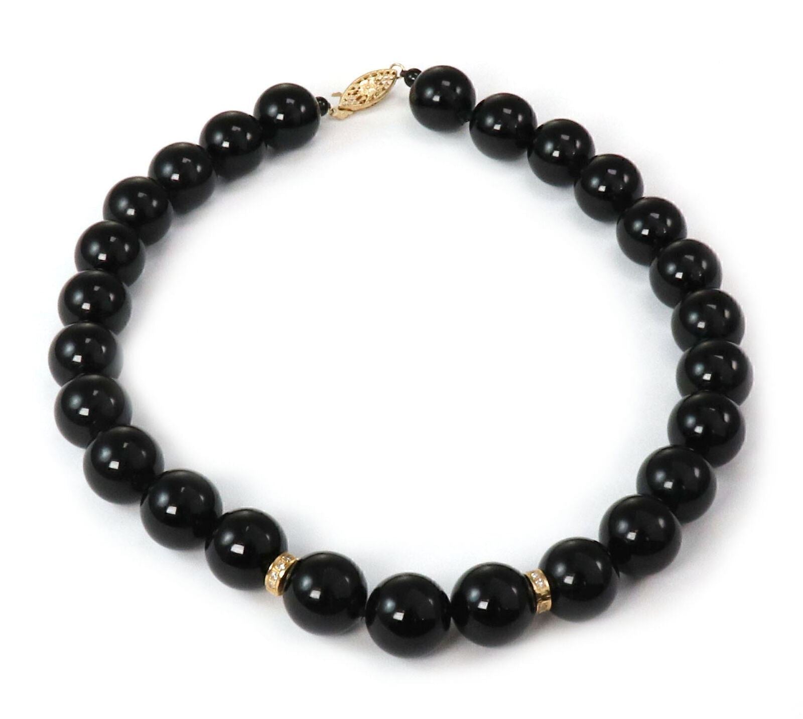 Diamond & 13.5mm Onyx Beads 14k Yellow Gold Necklace