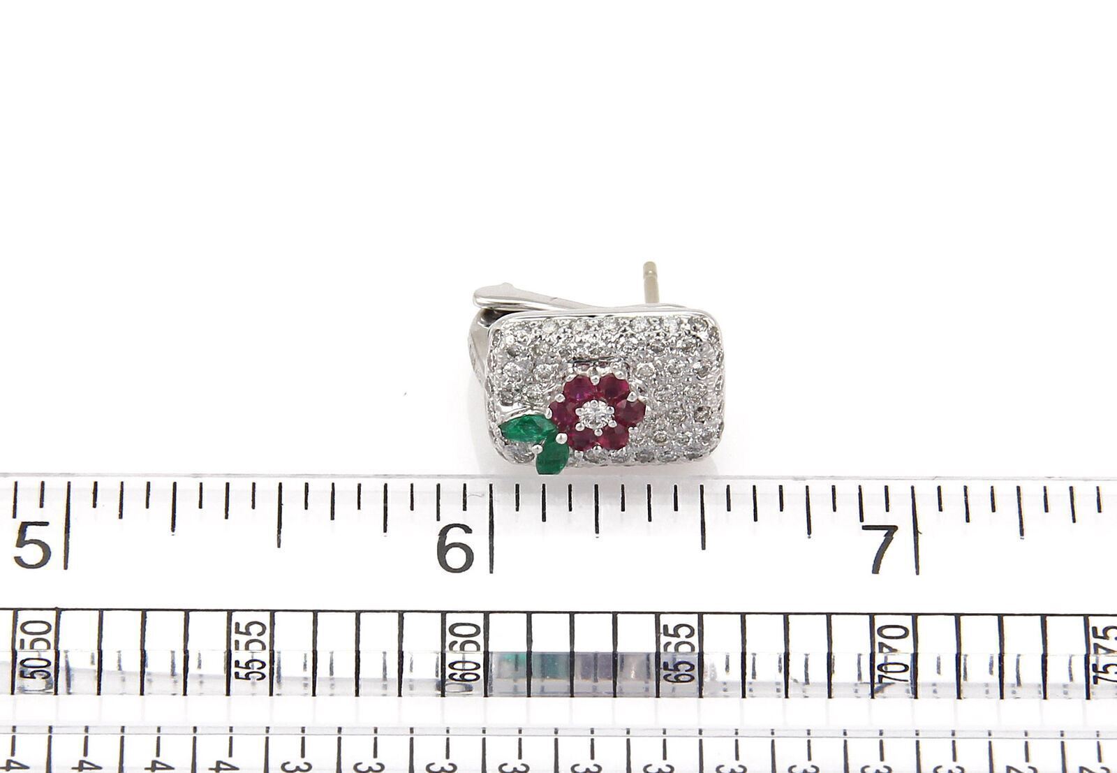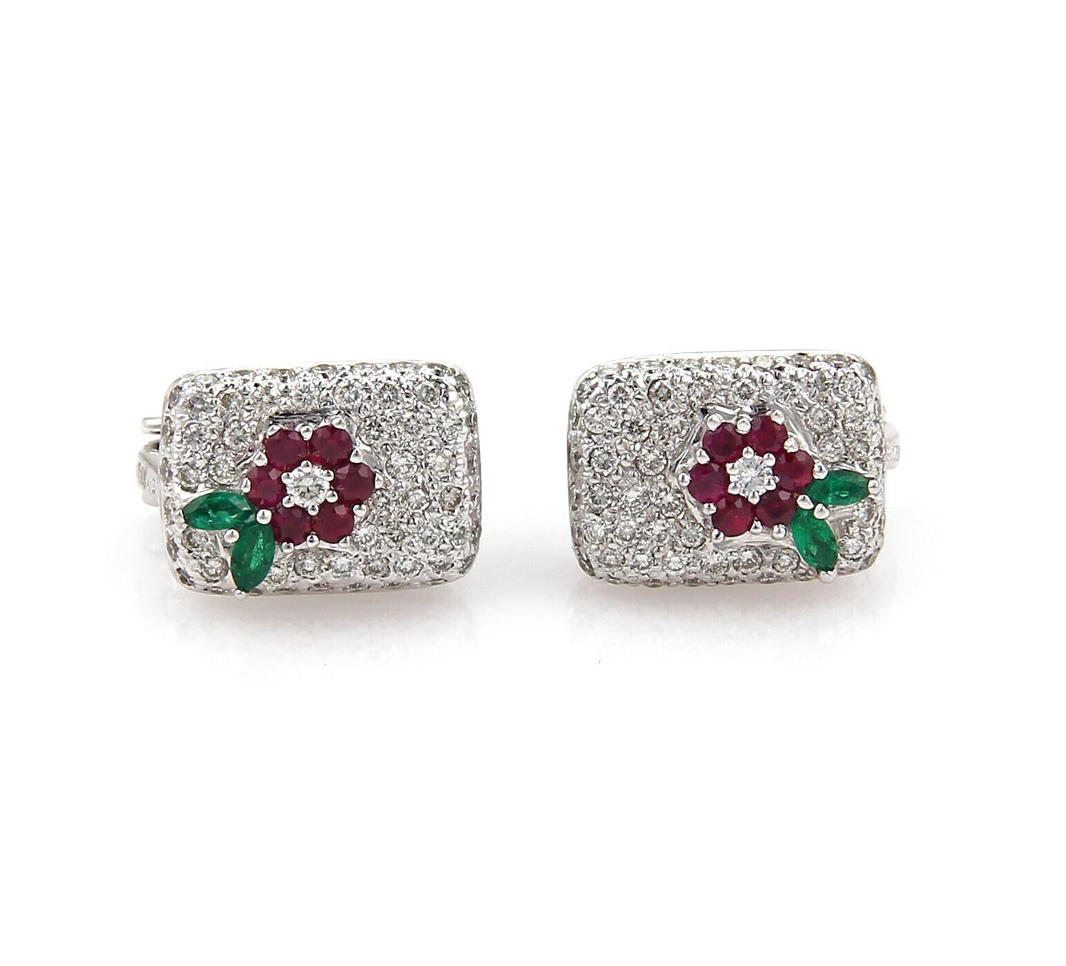 Diamond Emerald Ruby 18k White Gold Floral Earrings