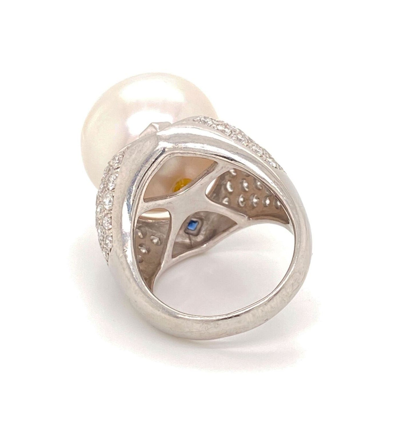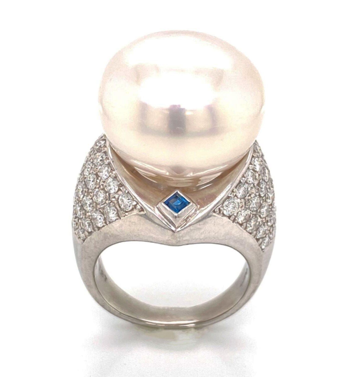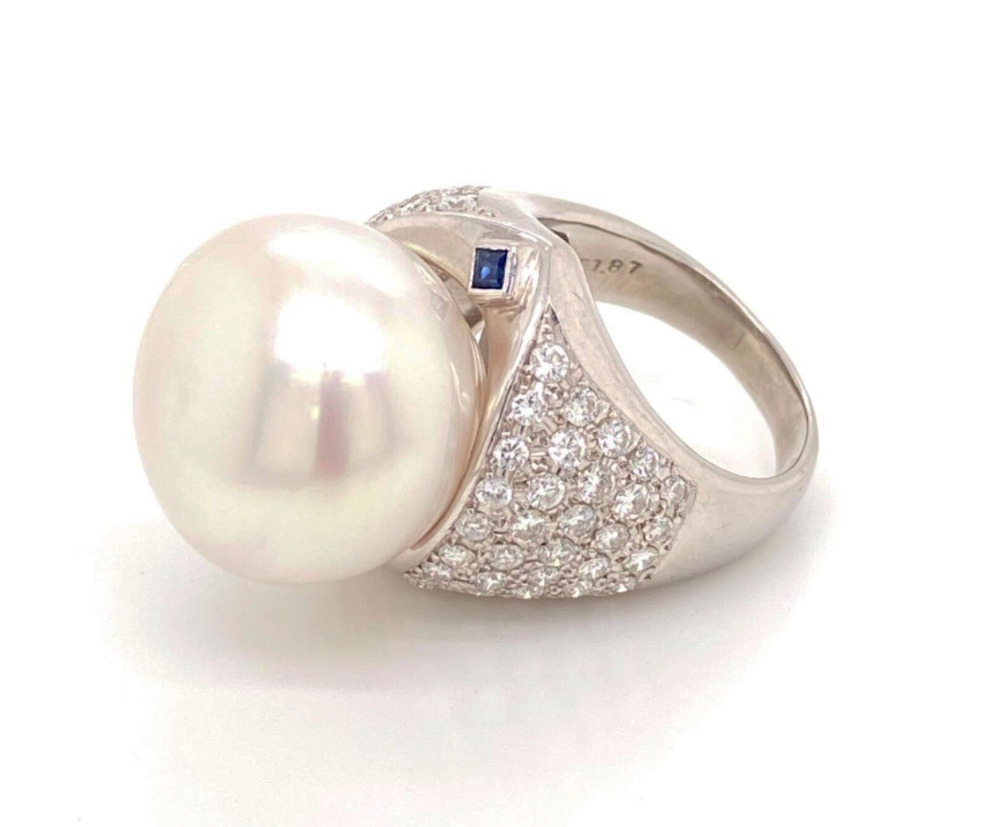 Platinum Large 18mm Pearl Diamond Sapphire Cocktail Ring - Size 8