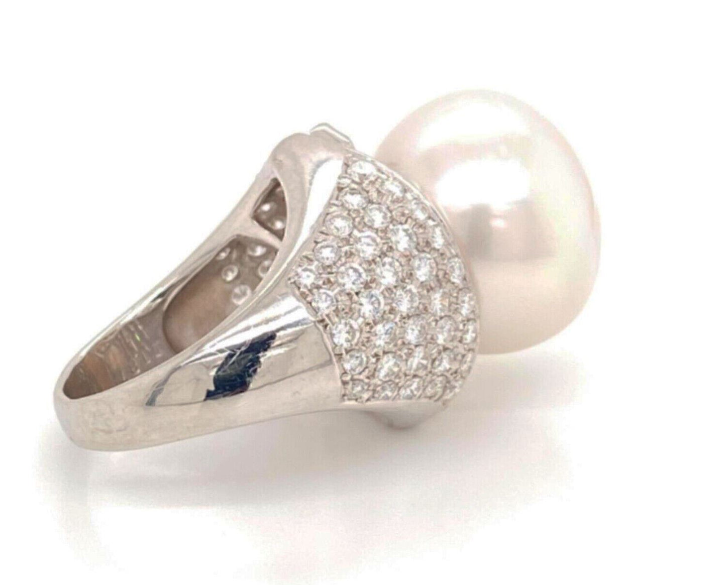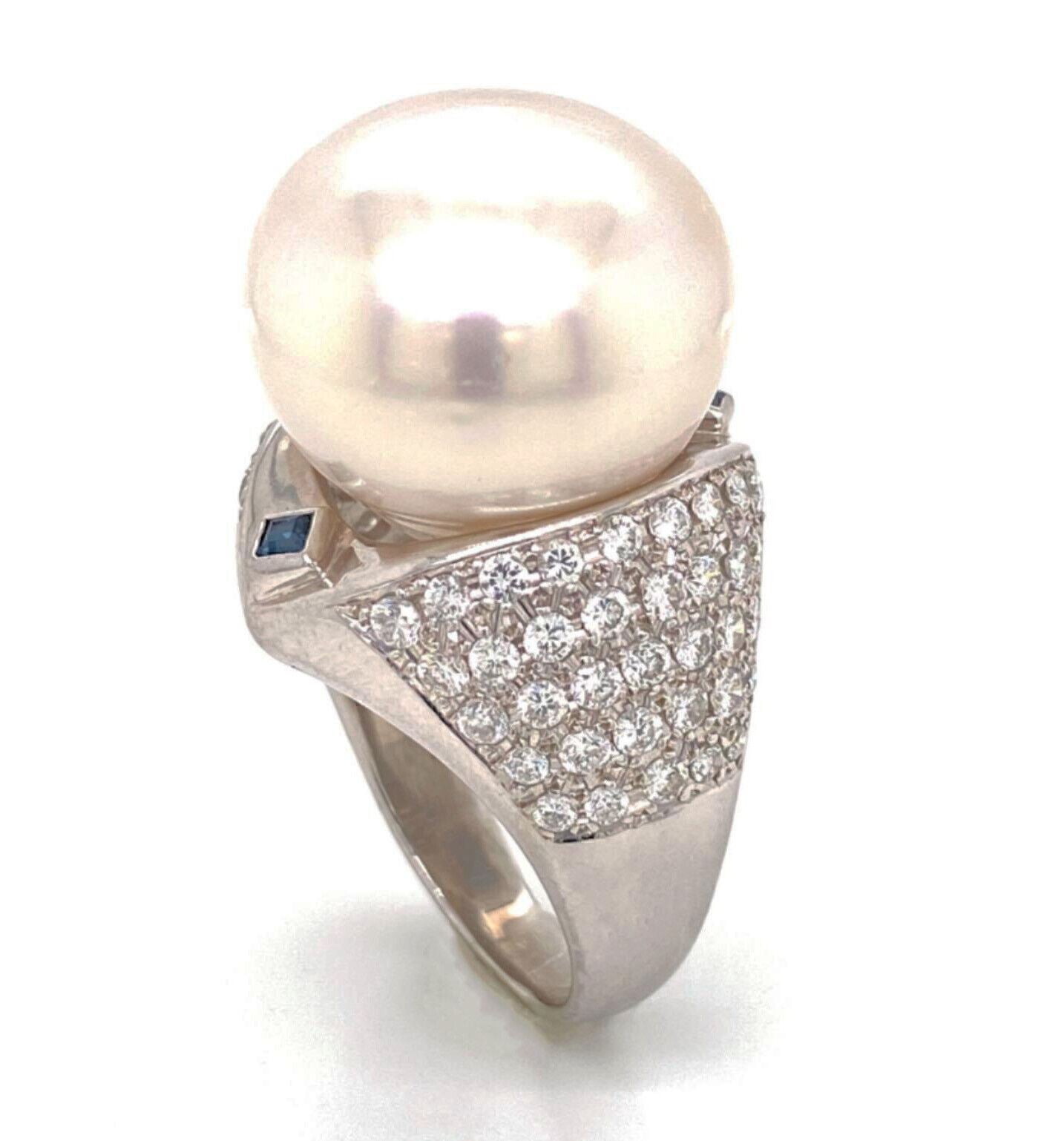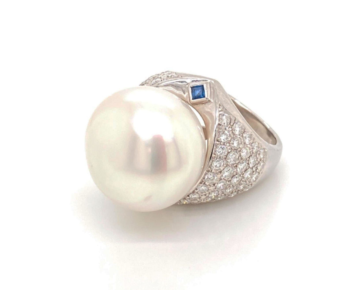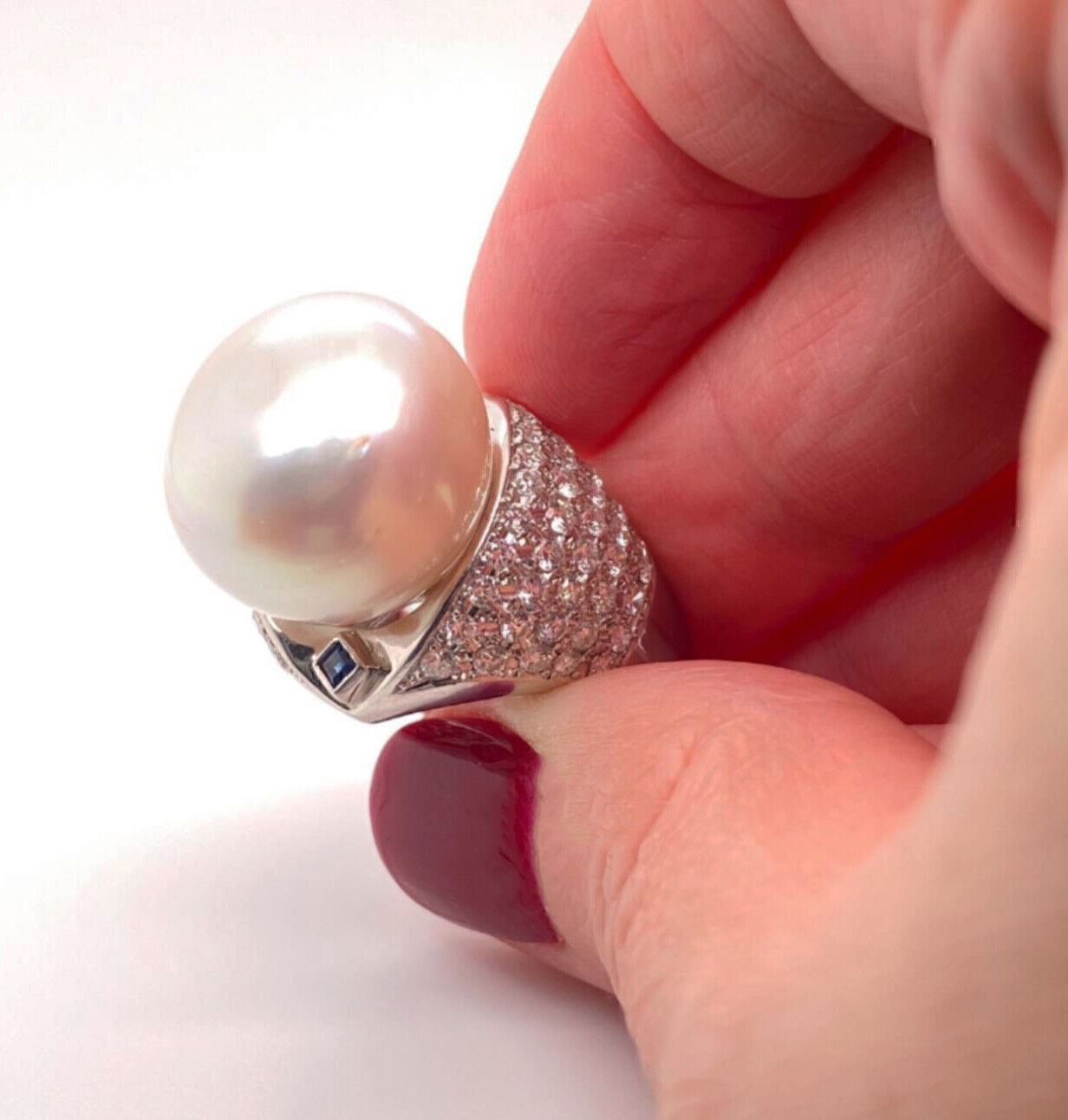 Platinum Large 18mm Pearl Diamond Sapphire Cocktail Ring - Size 8