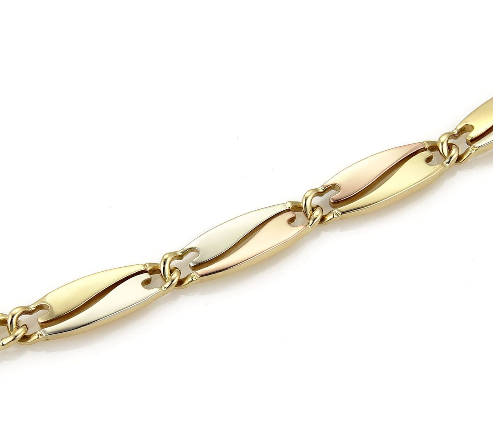 This is an elegant fancy link necklace from Quadri, it is crafted from solid 18k yellow, rose and white gold with a high polished finish. The links are a fancy long curved design a king of ying yang style and it fastens with a push in clasp with latch for added security. It is signed Quadri 750.
