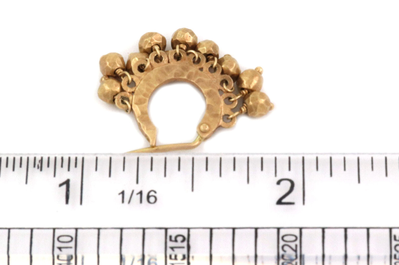 This is a beautiful pair of vintage earrings from designer Talisman, crafted from 14k yellow gold with a cluster of hand hammered gold beads dangling from a half moon shape hoop earrings. It is hallmark Talisman 14k and secures with a snap shut post.