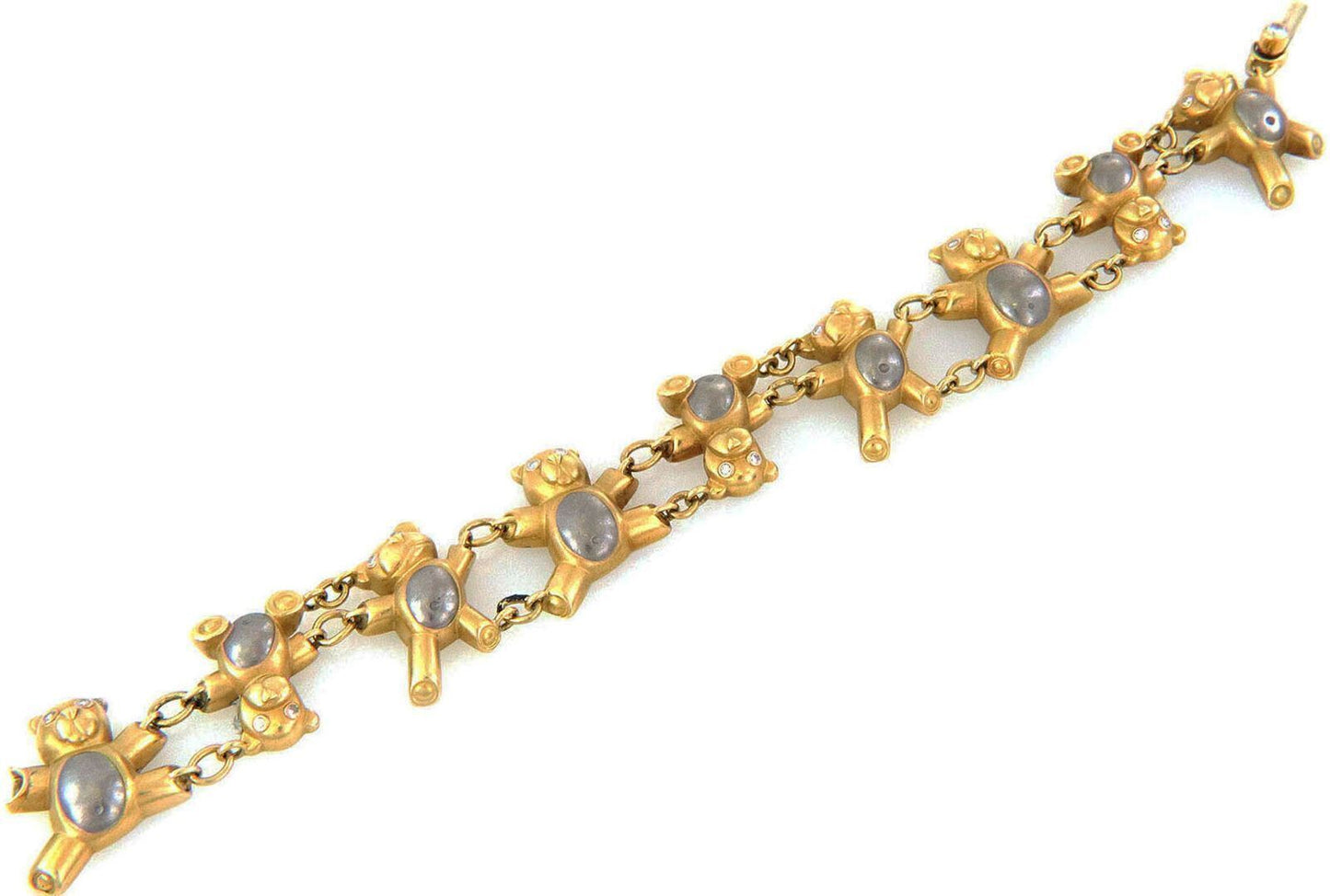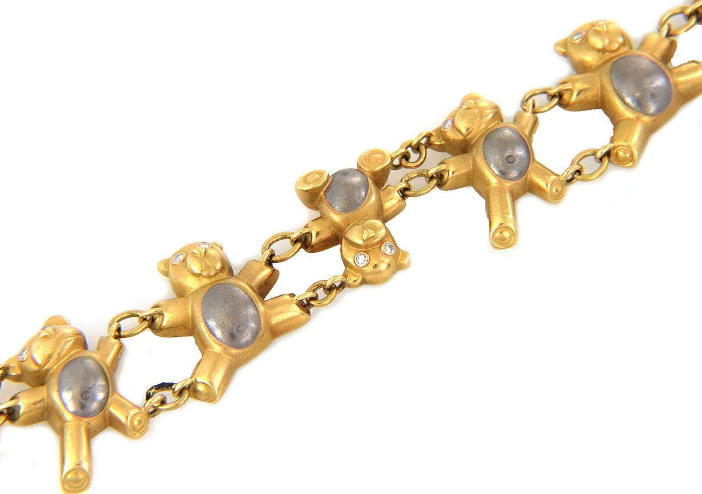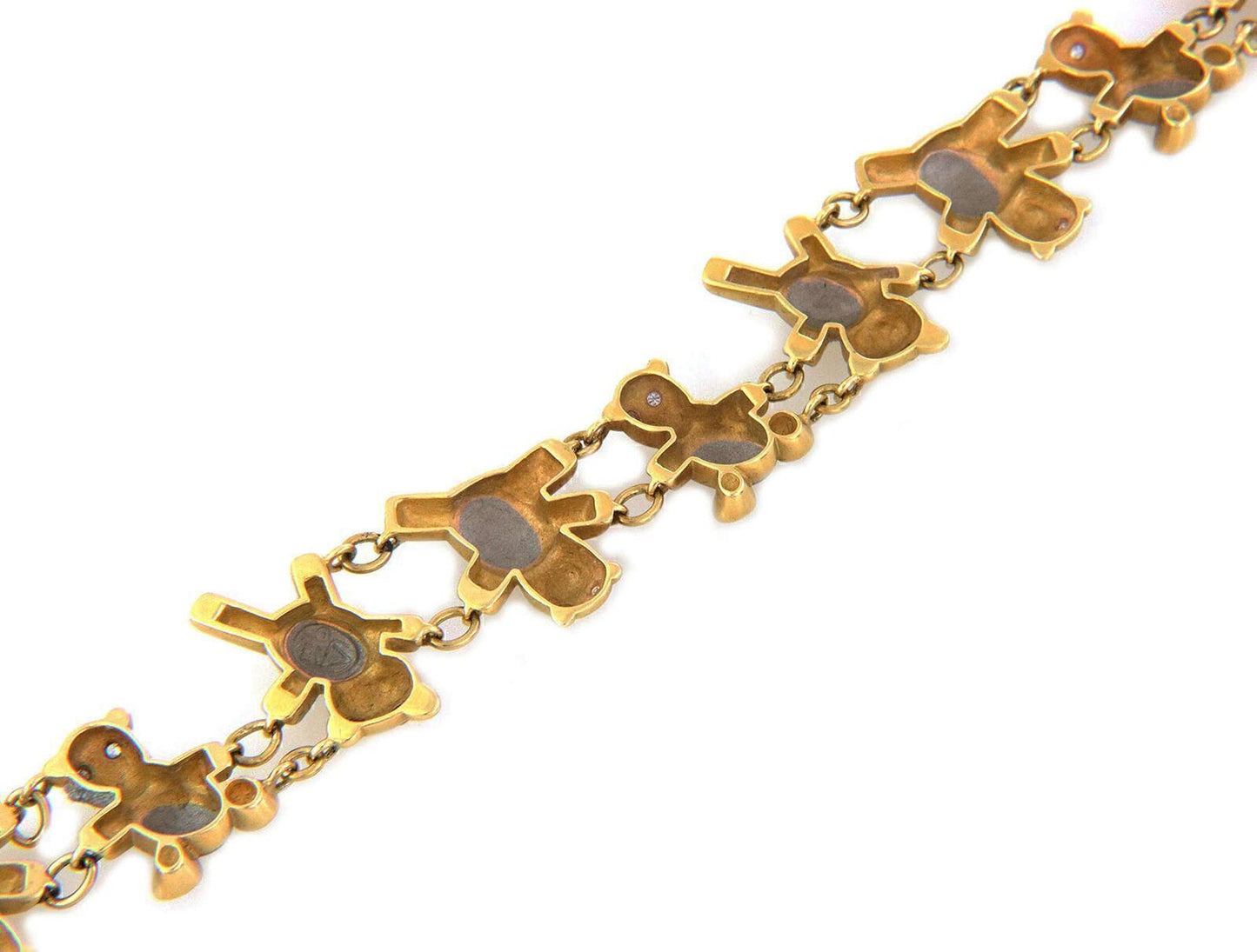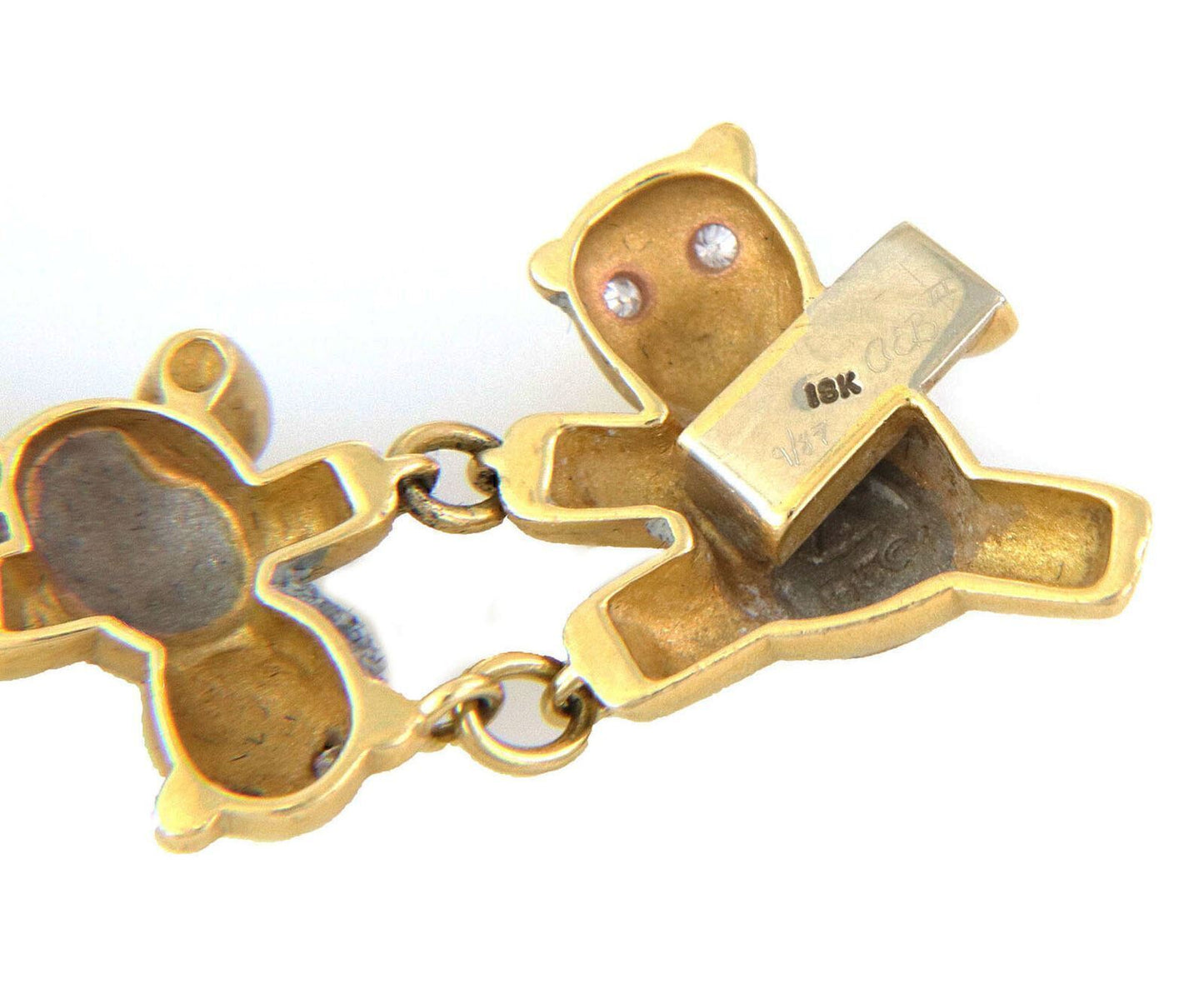 This is an adorable bracelet is crafted from 18k yellow and white gold featuring 9 full figure teddy bears with diamond eyes. Yellow gold body and white gold on the front of its body. Each bear is joined oval links attached to both hands and feet. The bracelet secure with a push in clasp and has the 18k gold content stamp.