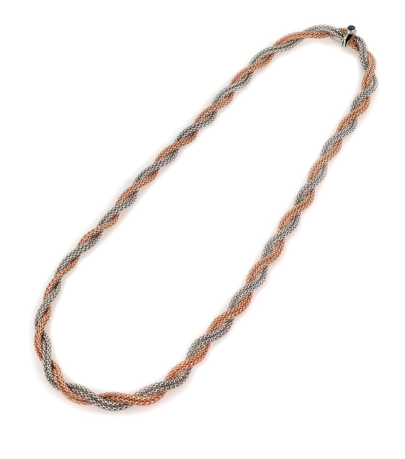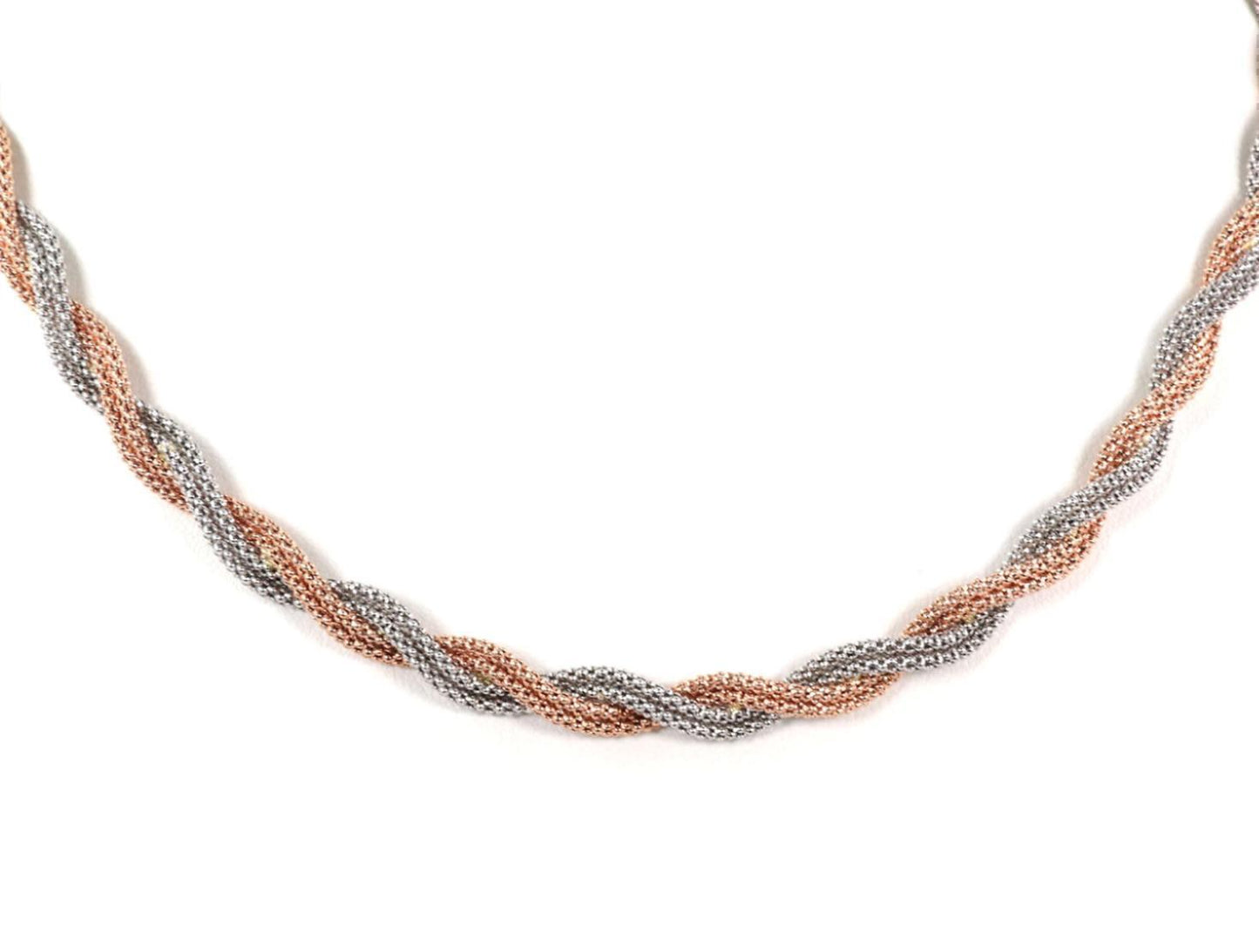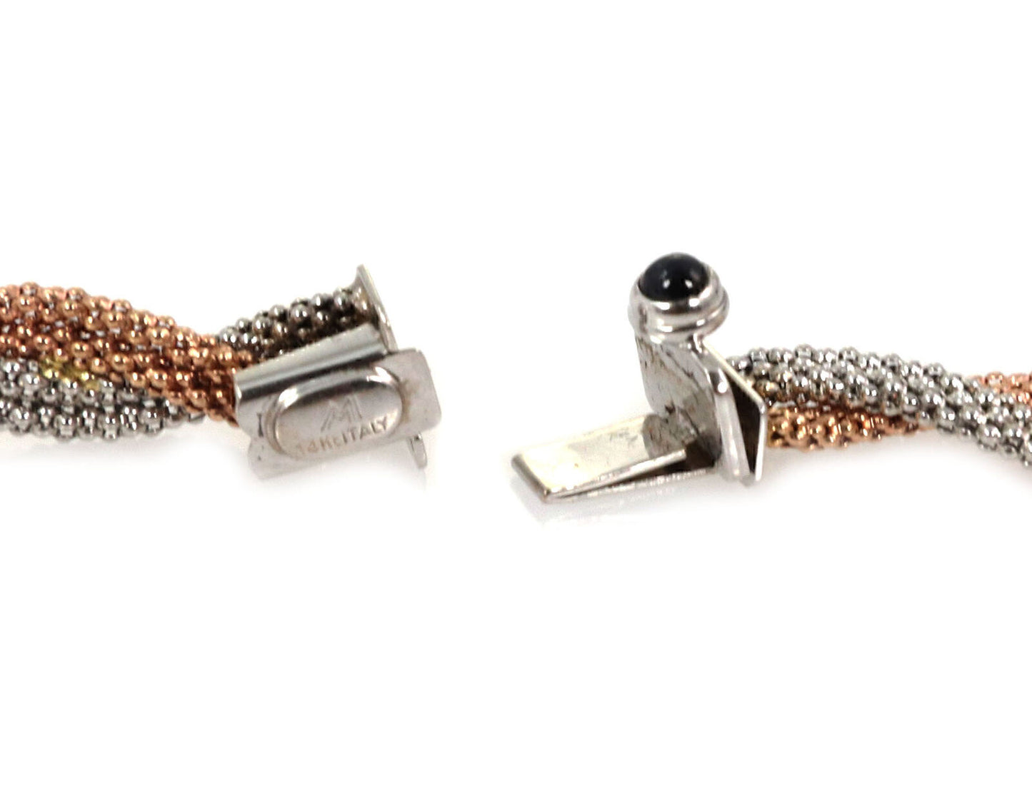 This is a lovely intertwined collar necklace, it is crafted from 14k rose and white gold featuring a double strand mesh bead style with the white and rose gold set in a twisted pattern along the entire length of the necklace. It secures with a push in clasp accented with a small cabochon sapphire gemstone. It has the gold content stamp.